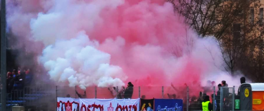 Et pour finir encore de la neige, encore de la pyro mais cette fois-ci pour les locaux et les visiteurs avec environ une centaine d'ultras d'Ostrow étrennant leur nouvelle bâche (reprennant une ancienne et historique bâche) et des locaux tout feu tout flamme sur le terrain et en tribune.